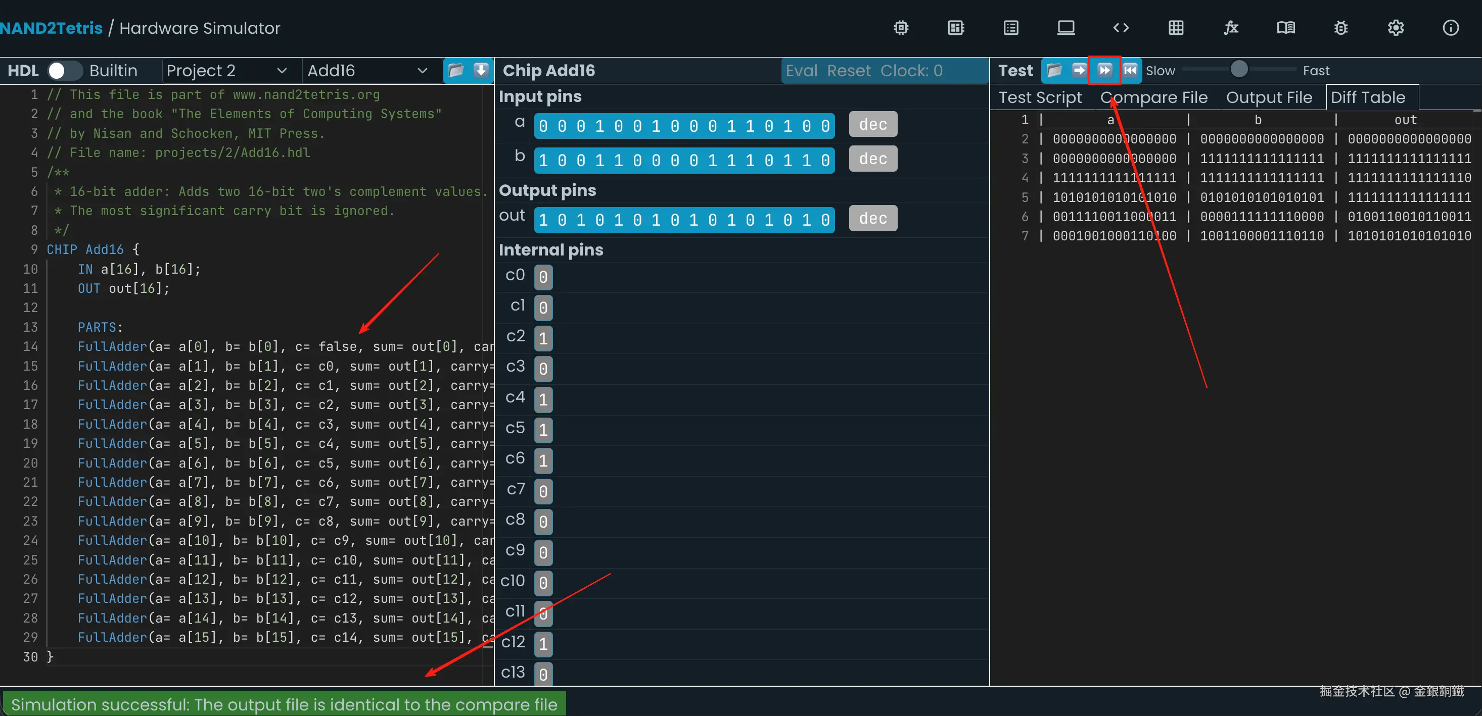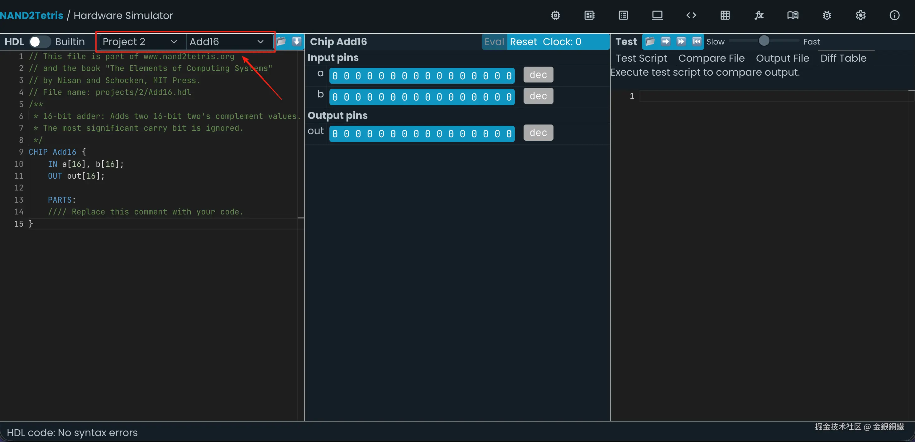前往 Nand to Tetris Online IDE,选择 Project 2 里的 Add16,效果如下图所示 ⬇️