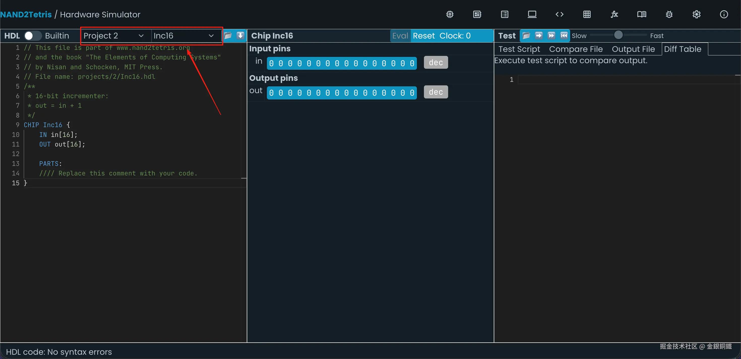 前往 Nand to Tetris Online IDE,选择 Project 2 里的 Inc16,效果如下图所示 ⬇️