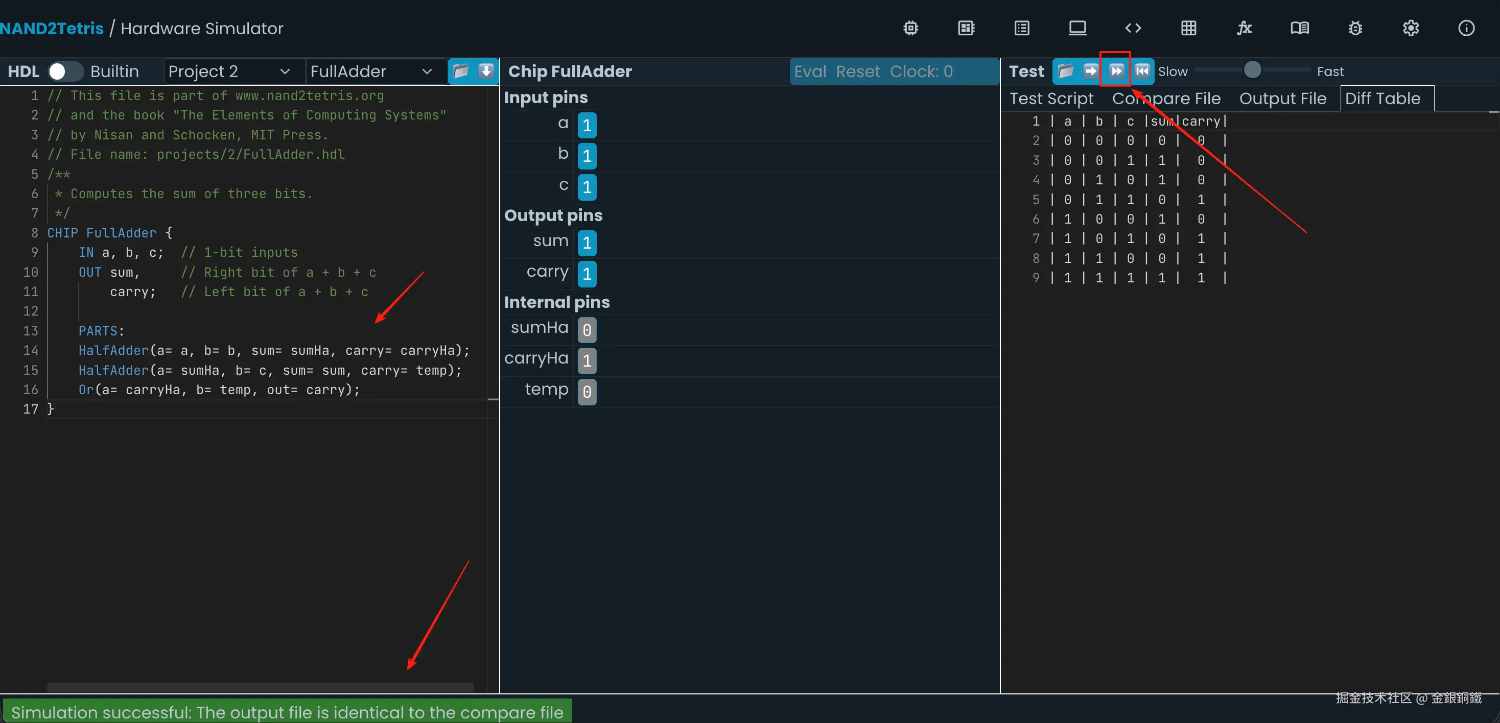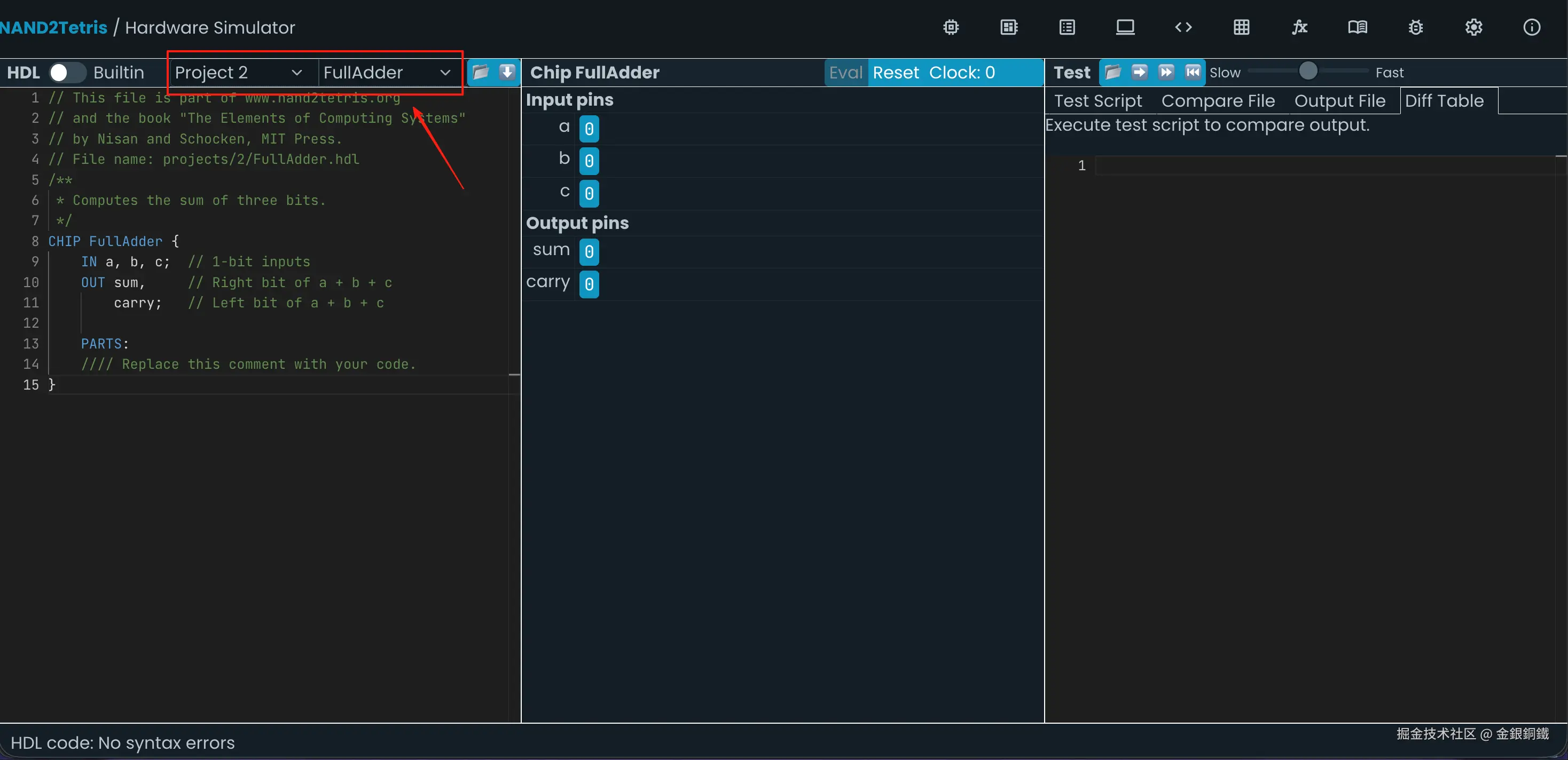前往 Nand to Tetris Online IDE,选择 Project 2 里的 FullAdder,效果如下图所示 ⬇️