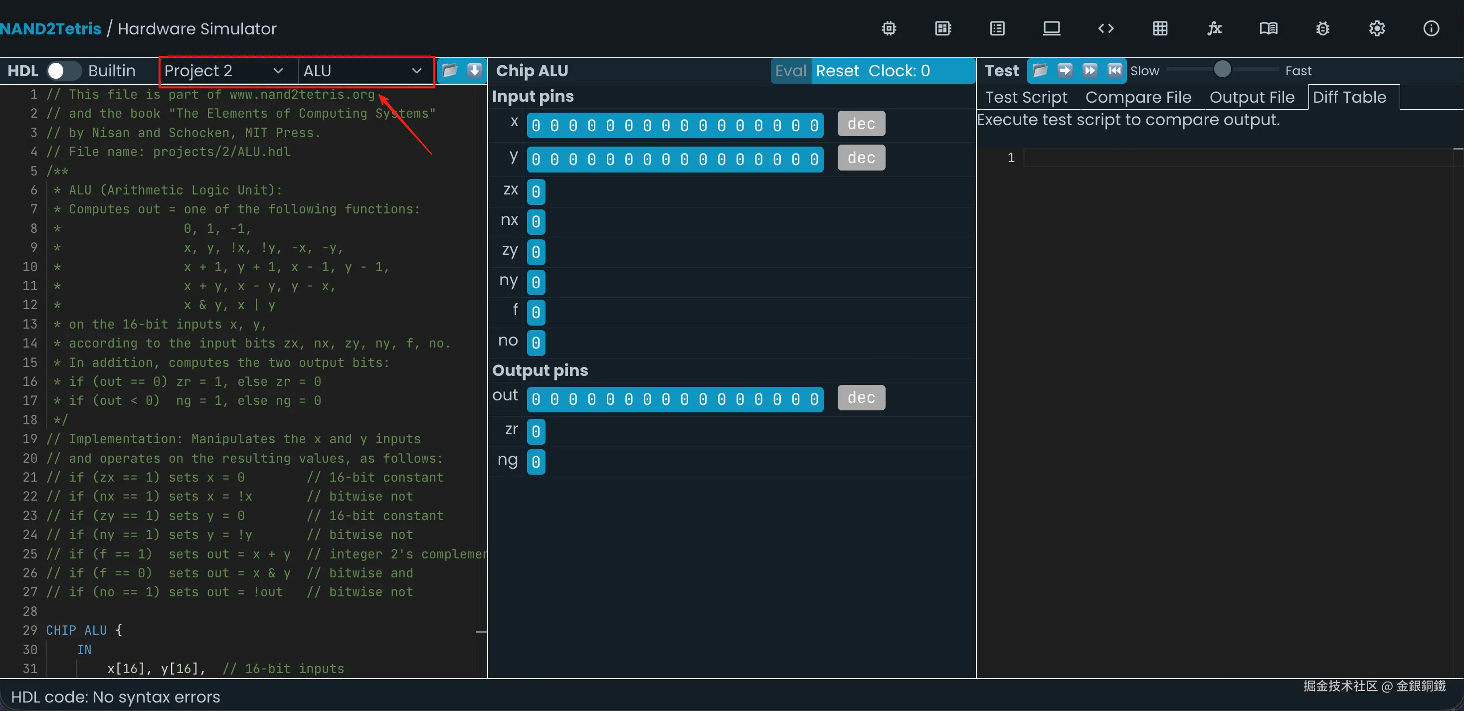 前往 Nand to Tetris Online IDE,选择 Project 2 里的 ALU,效果如下图所示 ⬇️