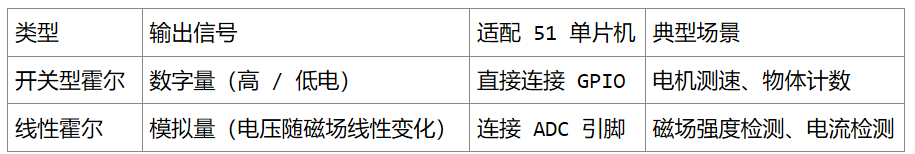 霍尔传感器是一种基于霍尔效应的磁敏传感器,可用于检测磁场强度、物体位置、转速等场景,在 51 单片机项目中应用广泛(如电机测速、接近开关、行程检测)。