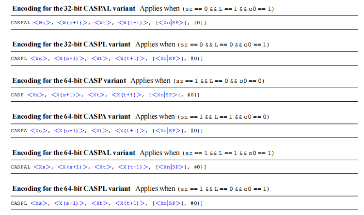 CASP / CASPA / CASPL / CASPAL 是对内存中**一对字(32-bit)或一对双字(64-bit)**做原子 Compare-And-Swap Pair 的指令:读出内存对并与第一对寄存器比较;若相等则把第二对寄存器的值写入内存;读/写作为一个原子事务发生(读与写之间不会被其他处理器打断)。
