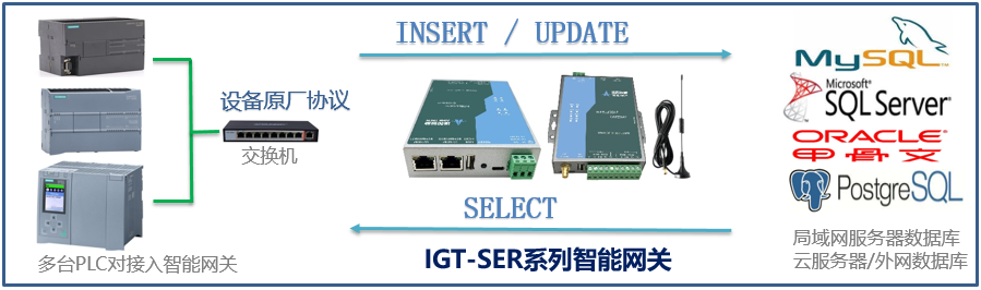 IGT-DSER智能网关模块,支持各种PLC、智能仪表、远程IO与数据库之间双向通讯,既可以读取设备的数据上报到SQL数据库,也可以从数据库查询数据后写入到设备;数据库软件支持MySQL、SQLServer、PostgreSQL,以及Oracle、达梦数据库等。