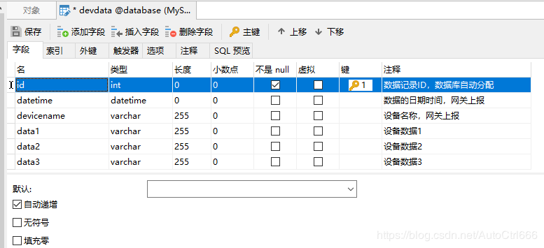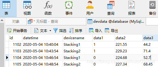 项目中有一台S7-1500和一台S7-1200的PLC,需要将其数据通过一个IGT-DSER智能网关采集到MySQL数据库 ;首先用数据库工具navicat连接数据库建立database数据库和devdata数据表,数据表的结构如下图: