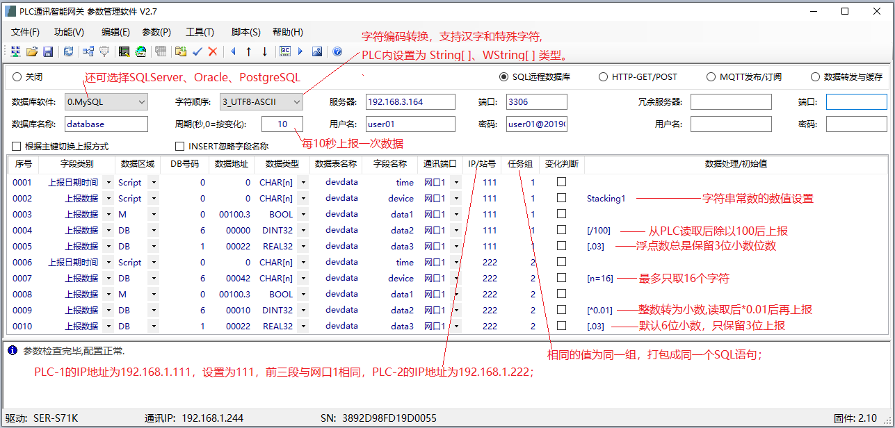 最后配置数据库参数和PLC数据寄存器地址,通过参数软件的功能视图->数据上报与平台对接,切换到如下画面: