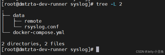 首选创建一个文件夹syslog,然后进入文件夹,创建文件夹data和下面的docker-compose.yml文件。在data里面再新建remote文件夹和rsyslog.conf文件,最后目录结构如下图所示: