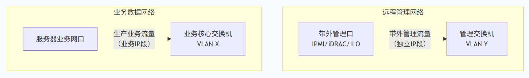 服务器的远程管理口(带外管理口 )强烈建议 连接到一台独立的交换机,或者连接到业务交换机上一个独立的、安全的VLAN 。绝对不能将它和业务网口混在同一个不安全的广播域内