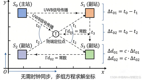 核心逻辑:终端发送信号,二维定位需 3 个基站,三维定位需 4 个基站,计算信号到达不同基站的"时间差",通过多组时间差建立方程,求解终端坐标(无需终端与基站同步时钟,是UWB的主流方案)。