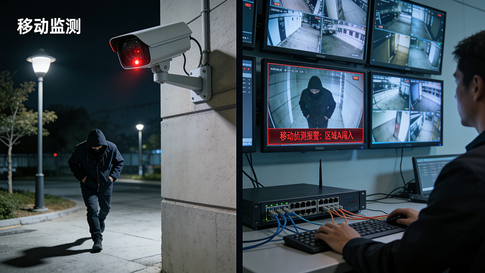 应用场景 **:**当有人闯入设防区域,移动侦测摄像头立即捕获画面,通过交换机快速传输至监控中心,同时触发报警并调转附近摄像头进行跟踪拍摄。