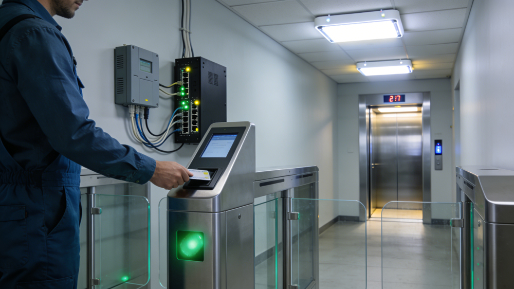 应用场景 **:**员工刷卡进入大楼,门禁控制器通过交换机验证权限后开启闸机,同时通知照明系统打开走廊灯光,电梯系统呼叫电梯至一楼等候。
