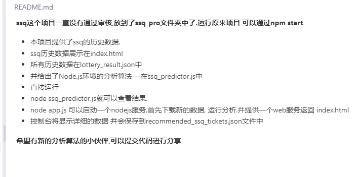 lottery_results.json:完整的双色球历史开奖数据(截至最近一期)index.html:前端展示页面,可视化历史数据ssq_predictor.js:核心预测脚本,基于号码出现频率进行加权随机生成app.js和README.md:辅助运行说明和路径配置