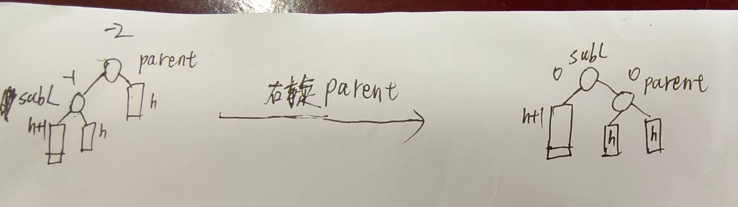 为-2说明parent左边高,那就找到parent左孩子节点subL,假如subL的平衡因子为-1,说明还是左边高,那就一个parent的右旋即可