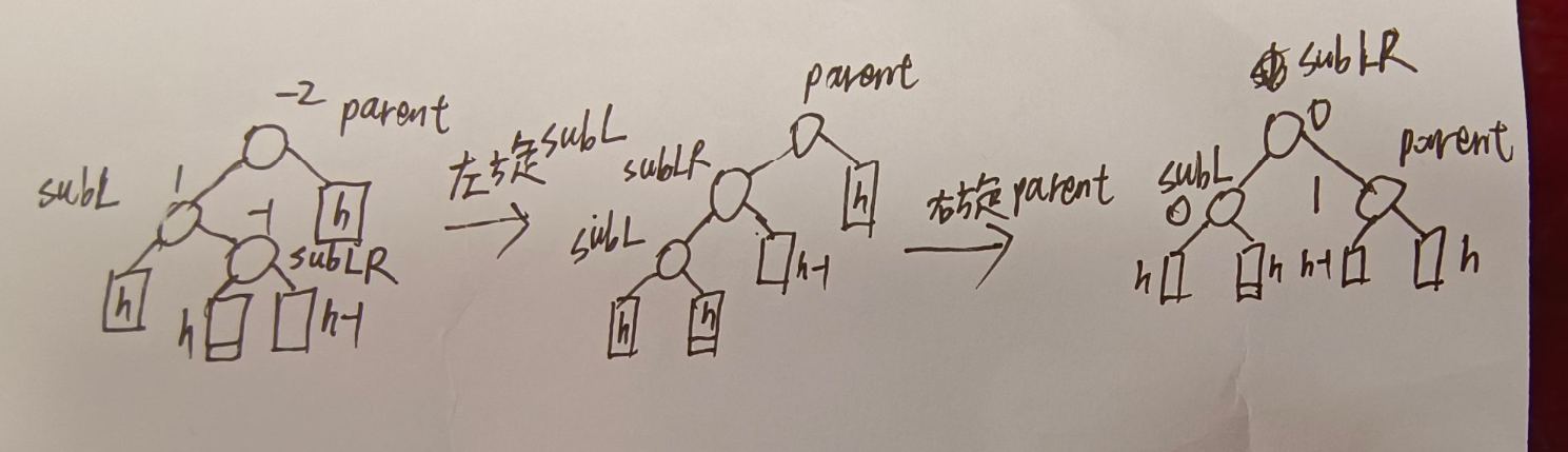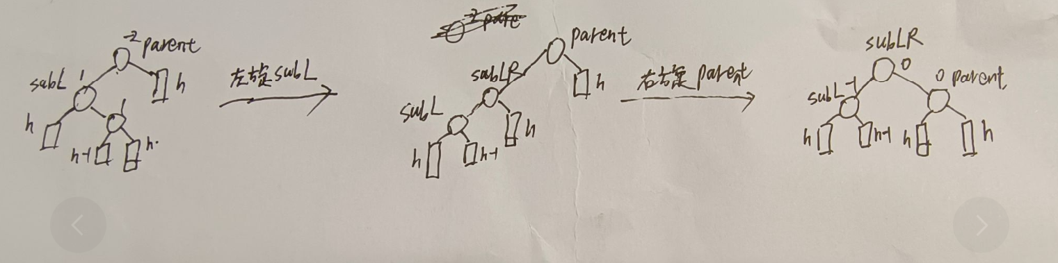 假如subL的平衡因子为1,那就说明右边高,这里subLR的平衡因子会影响最后parent和subL的平衡因子,却不会影响旋转的方式