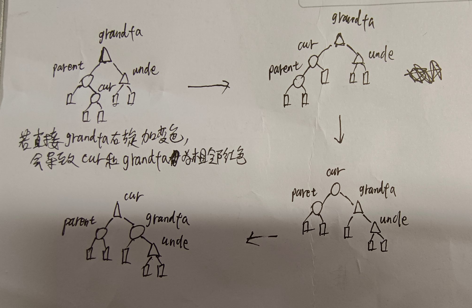 假如parent是左孩子,cur是右孩子,那这时单单一个右旋加变色就不行了,因为最后cur和grandfa都是红色,还是不合规则,所以要进行两次旋转,先对parent左旋,然后对grandfa右旋,最后将grandfa和变成红,cur变成黑