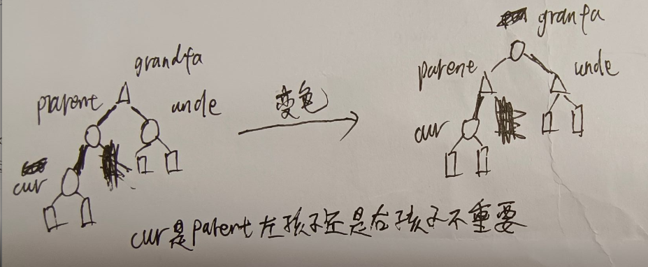 cur是parent的左孩子还是右孩子不重要,因为调整策略是给parent和uncle变色,根本就没有旋转
