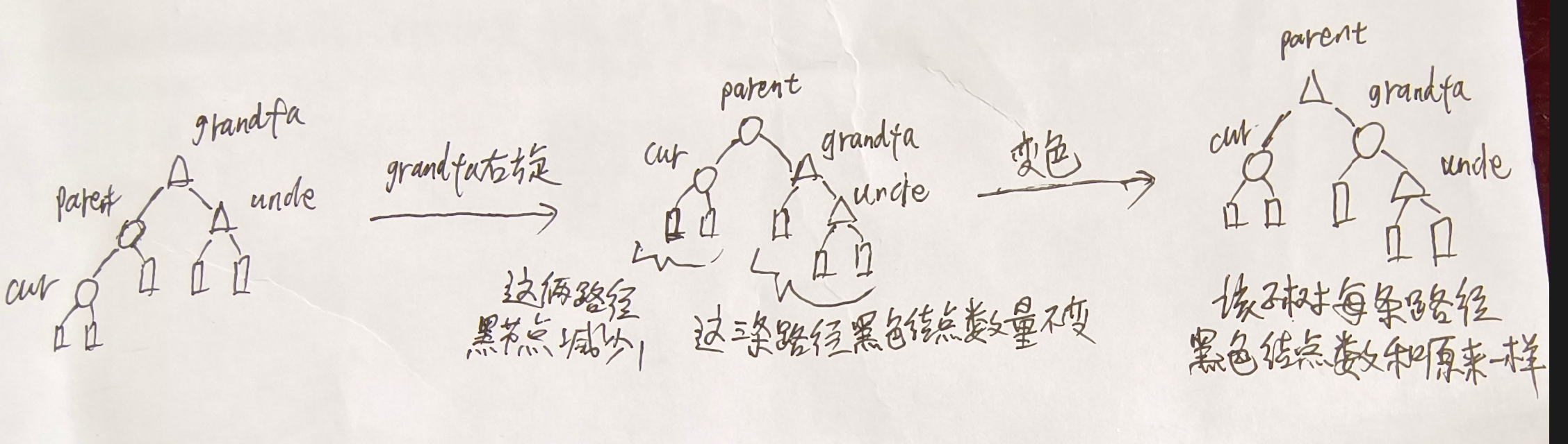 假如parent是左孩子,cur也是左孩子,那这时就grandfa右旋,右边的路径黑色节点个数不变,左边的黑色节点个数减1,然后grandfa变色,右边路径的黑色节点个数也减1,然后parent再变成黑色,所有路径黑色节点个数加一,和之前一样,并且此时不再需要往上继续调整了,因为parent是子树的根且是黑色