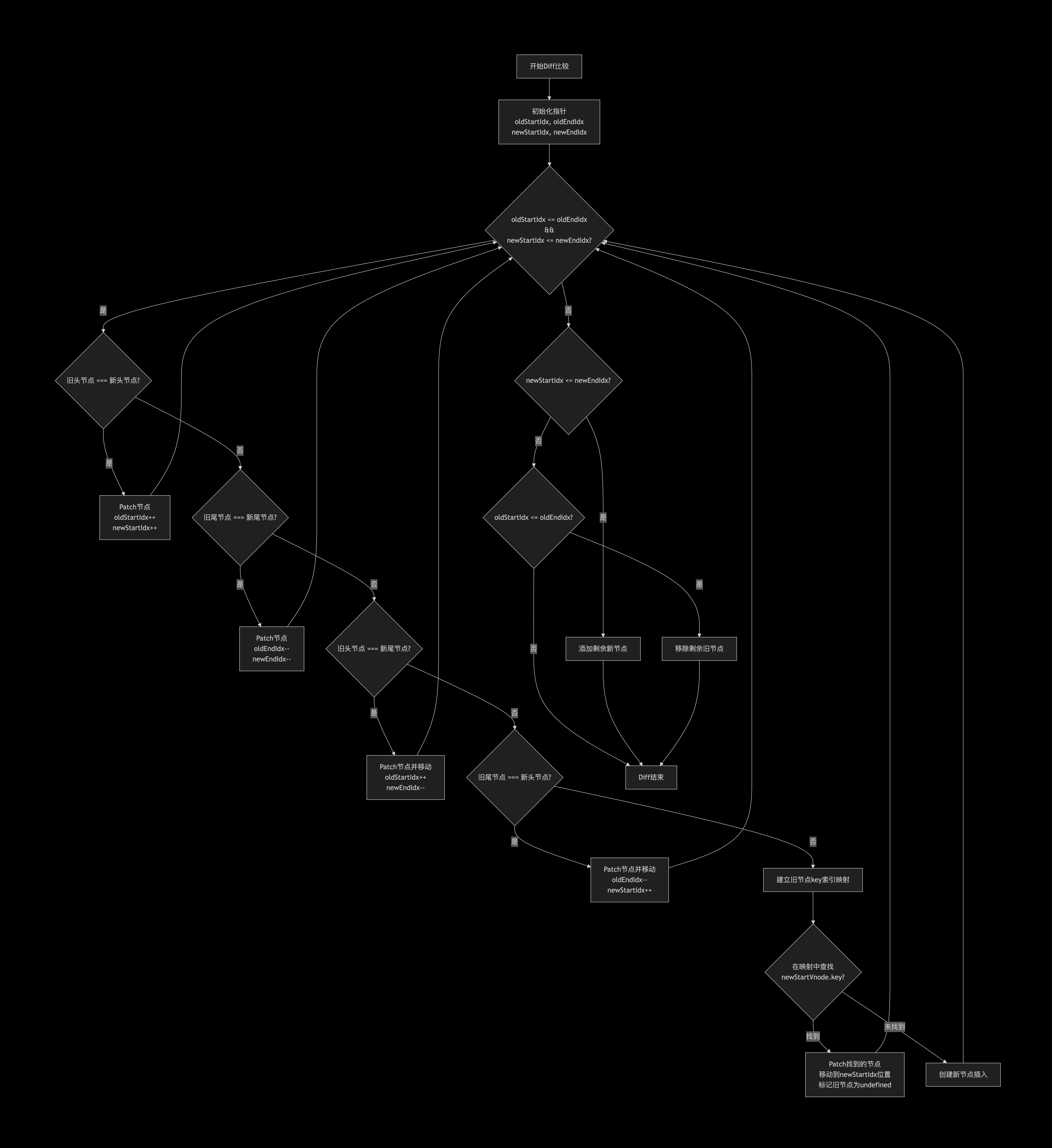 - Vue2采用双端比较:从两端向中间比较,适合顺序变化的场景