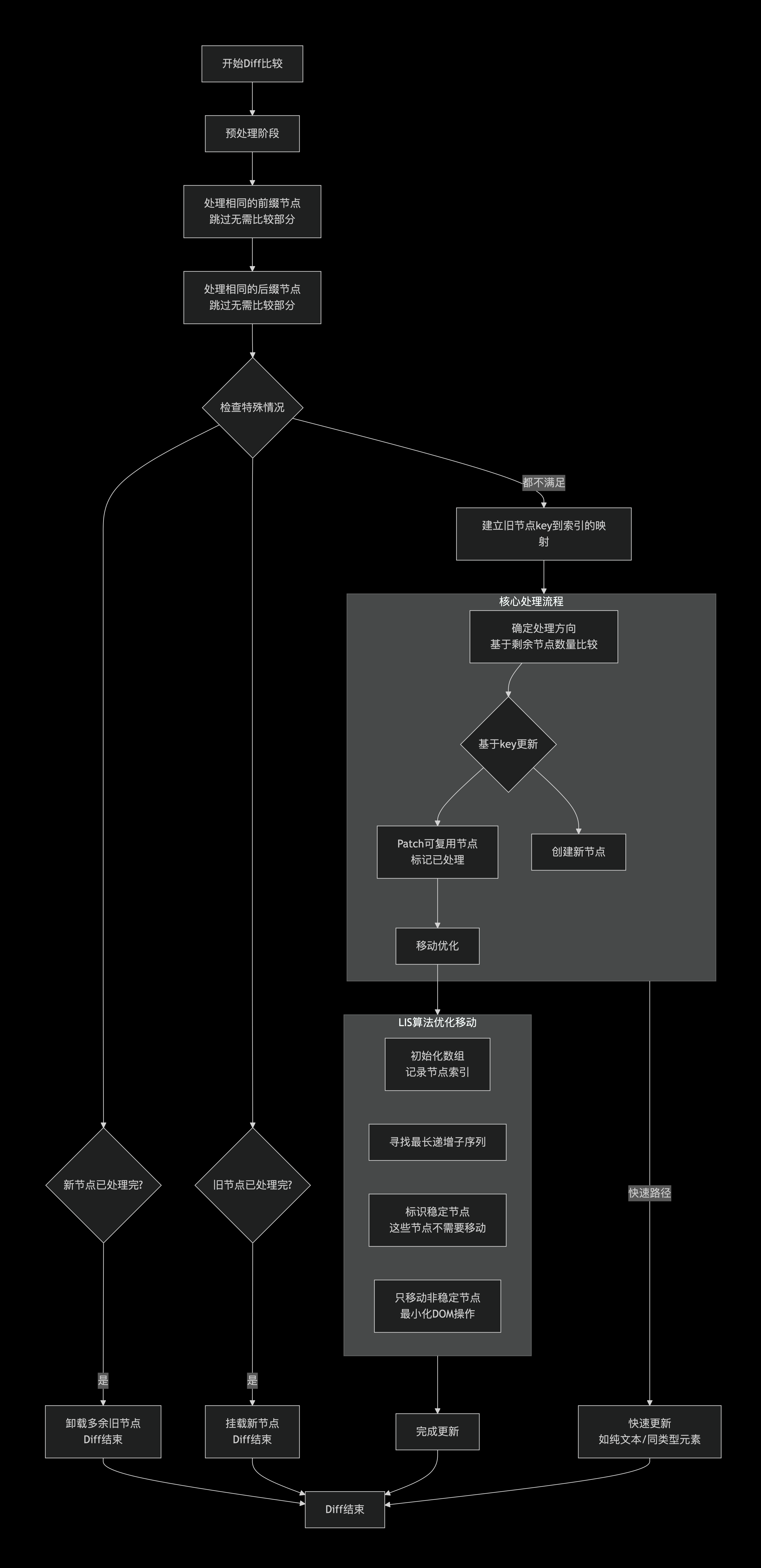 - Vue3采用预处理+LIS:先处理边界,再使用LIS优化中间乱序部分