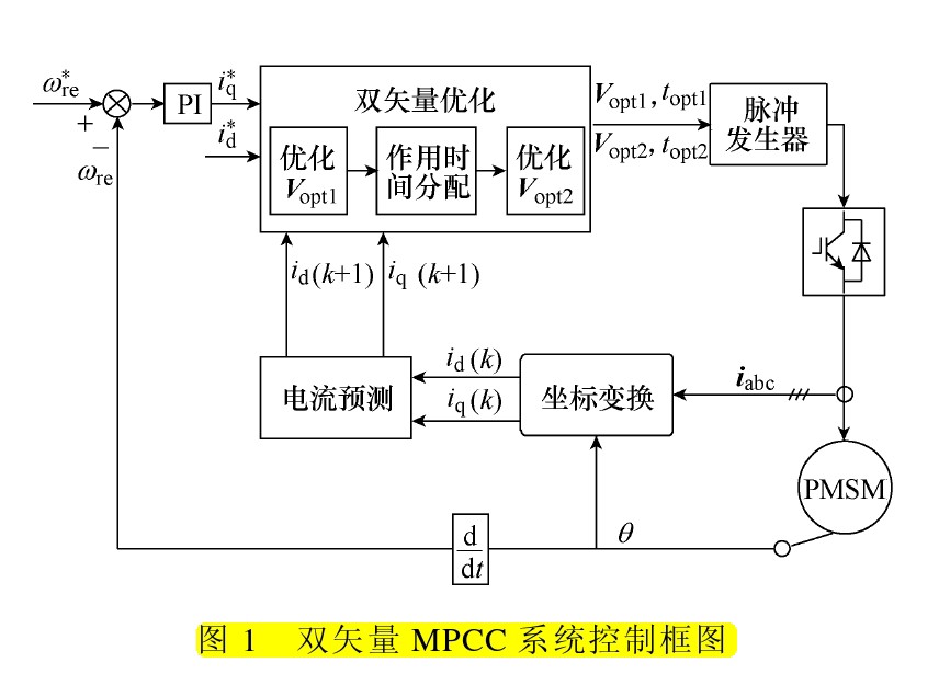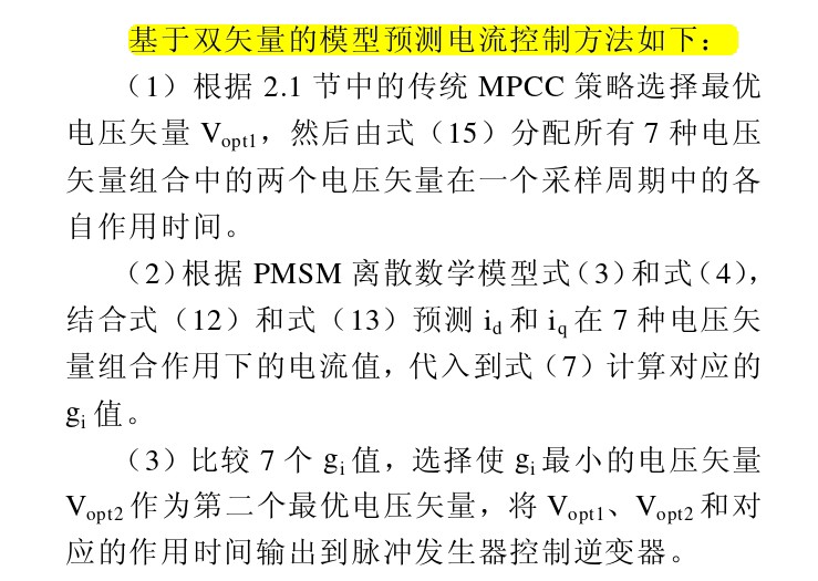 永磁同步电机双矢量MPC模型预测电流控制(有参考文献) 参考文献:《永磁同步电机双矢量模型预测电流控制_徐艳平》 (1)在占空比模型预测电流控制中,由于第二个电压矢量只能是零电压矢量,在每个采样周期中只能选择6个固定方向上的电压矢量,因此电流仍存在较大波动。 (2)双矢量模型预测电流控制方法:在每一个采样周期中进行两次电压矢量选择,可以在进行第二次电压矢量选择时采用非零电压矢量,电压矢量的选择范围扩大为任意方向、任意幅值的电压矢量,并且在价值函数中考虑了作用时间对电压矢量选择的影响,使得电压矢量的选择更加准确。 (3)仿真结果:具有良好的静动态性能,同时与占空比模型预测电流控制相比,该方法有效地减小了电流波动。