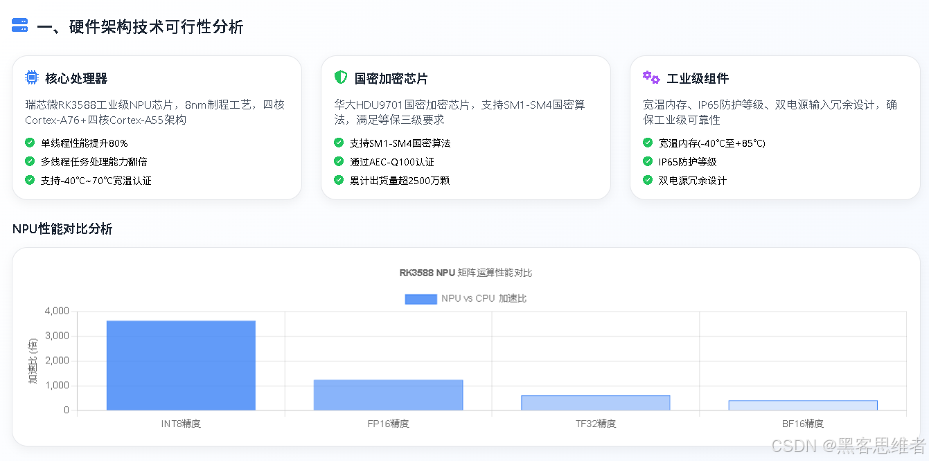 分析范围涵盖了从芯片级硬件设计到系统级软件架构的完整技术栈,重点关注 RK3588 工业级 NPU 芯片的性能表现、50 + 通信协议的集成能力、边缘 AI 算法的部署方案,以及满足等保三级、国密算法等安全合规要求的技术路径。