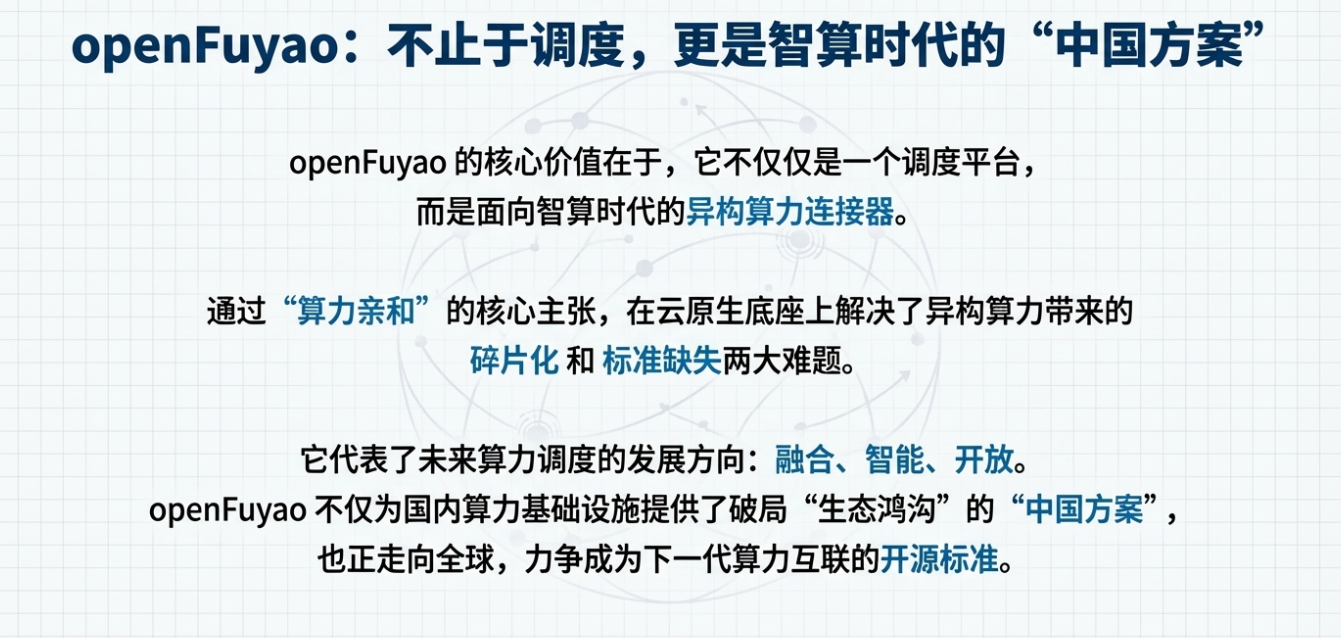 openFuyao 代表了未来算力调度的发展方向:融合、智能、开放。它不仅为国内算力基础设施提供了破局"生态鸿沟"的"中国方案",也正在走向全球,力争成为下一代算力互联的开源标准。