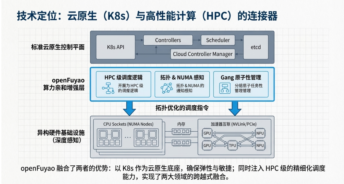 openFuyao 在现有技术生态中找到了精准的定位:云原生(K8s)与高性能计算(HPC)的连接器。
