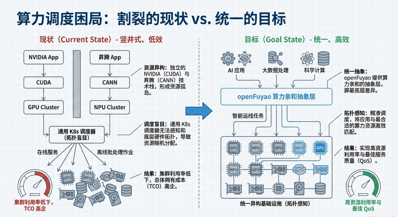 面对AI时代异构算力并存带来的资源异构性、软件环境碎片化和生态割裂等严峻挑战,openFuyao 社区应运而生。本文结合算力调度行业报告,深入剖析 openFuyao 的核心主张,即实现真正的"算力亲和"(Compute-Friendly)。