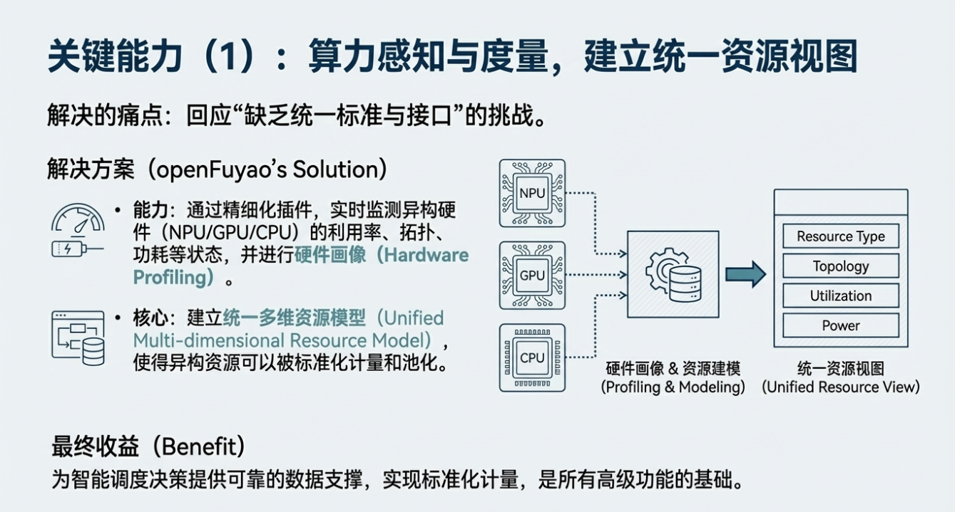 通过精细化插件,实时监测异构硬件(NPU/GPU/CPU)的利用率、拓扑、功耗等状态,并进行画像。它建立了统一的多维资源模型,使得异构资源可以被标准化计量和池化,为智能决策提供可靠数据支撑。