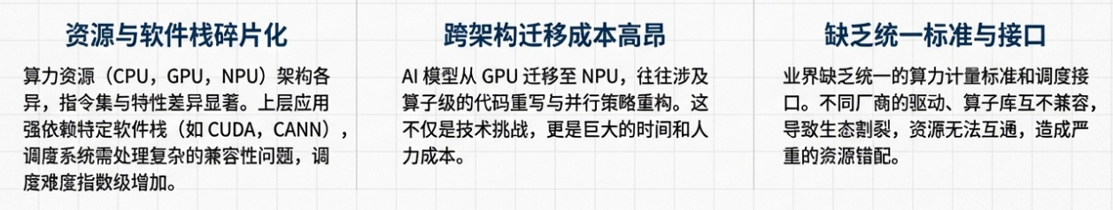 - 缺乏统一调度标准与接口,生态割裂: 现阶段缺乏统一的计量标准和接口规范,不同厂商芯片的驱动、算子库存在差异,导致跨架构资源难以互通,引发资源错配与利用率低下。