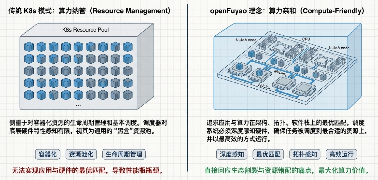传统基于 Kubernetes 的调度平台侧重于对容器化资源的"纳管"。openFuyao 则超越了这一目标,追求 "算力亲和"(Compute-Friendly)。