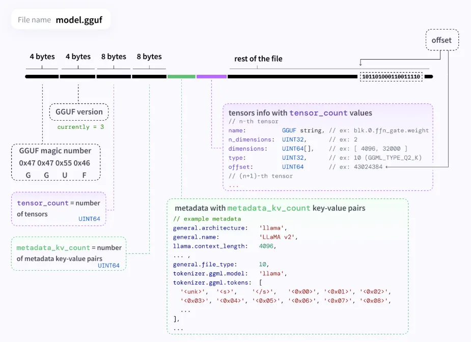 另一种文件格式是 GGUF (GPT-Generated Unified Format),支持 LLM 的优化管理。GGUF 可以存储张量加上元数据,并支持不同类型的量化和微调。