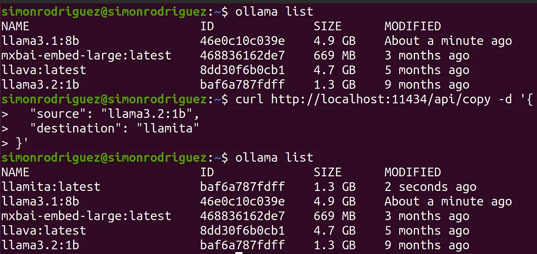 - /api/copy : POST 方法。相当于 ollama cp,用于在本地复制一个现有模型。