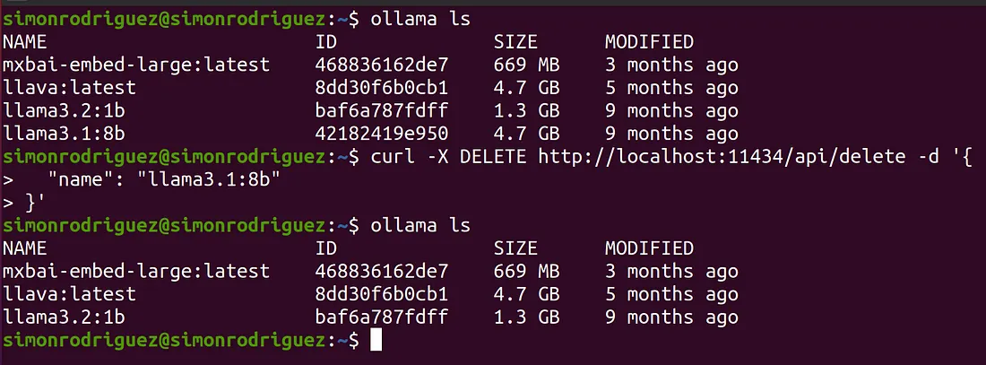 - /api/delete : DELETE 方法。相当于 ollama rm 命令,用于从本地系统删除一个模型。