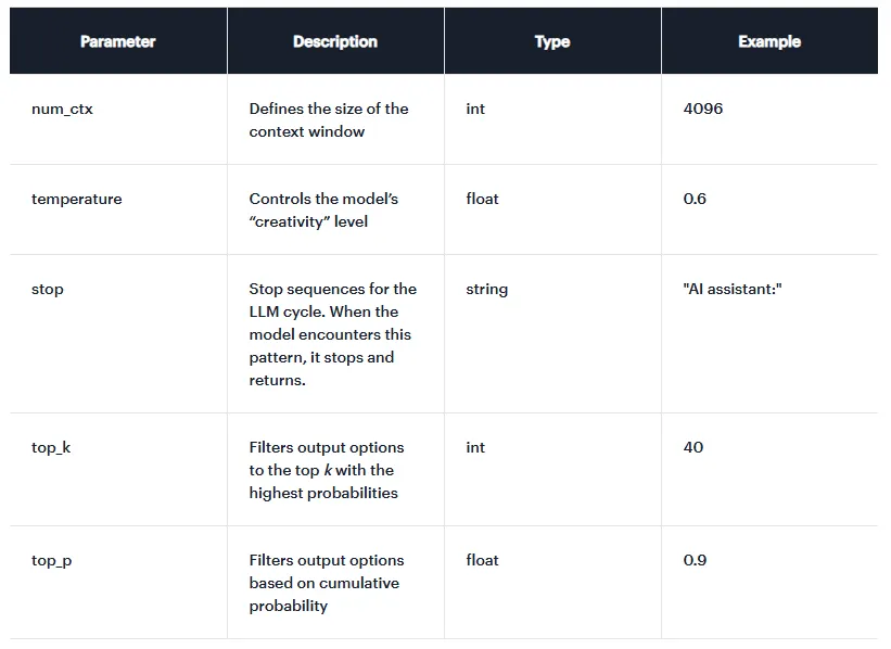 这些是最重要的参数,但还有很多其他参数。根据跟 Ollama 的交互方式(CLI、API、modelfile),不是所有参数都能配置。