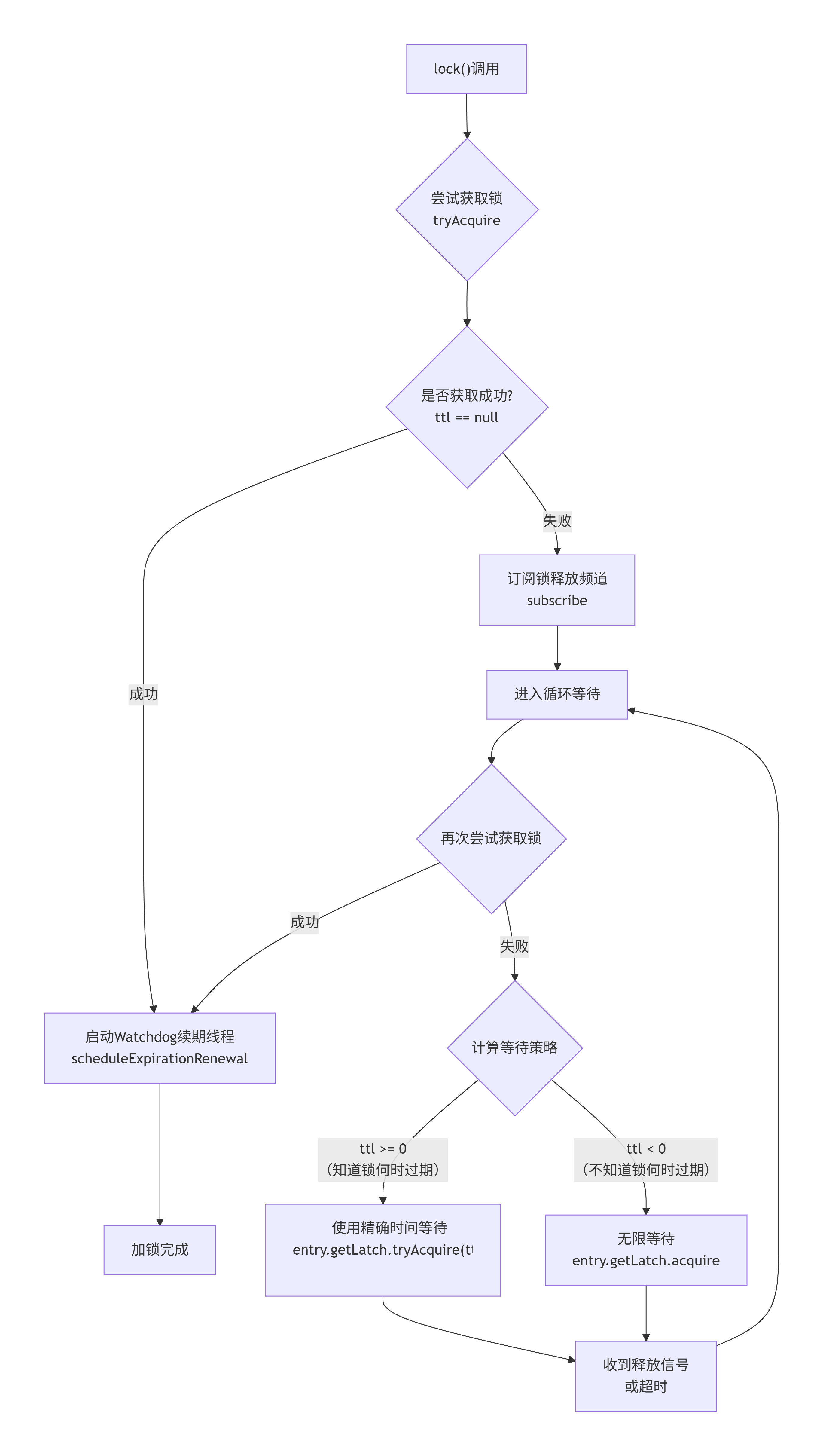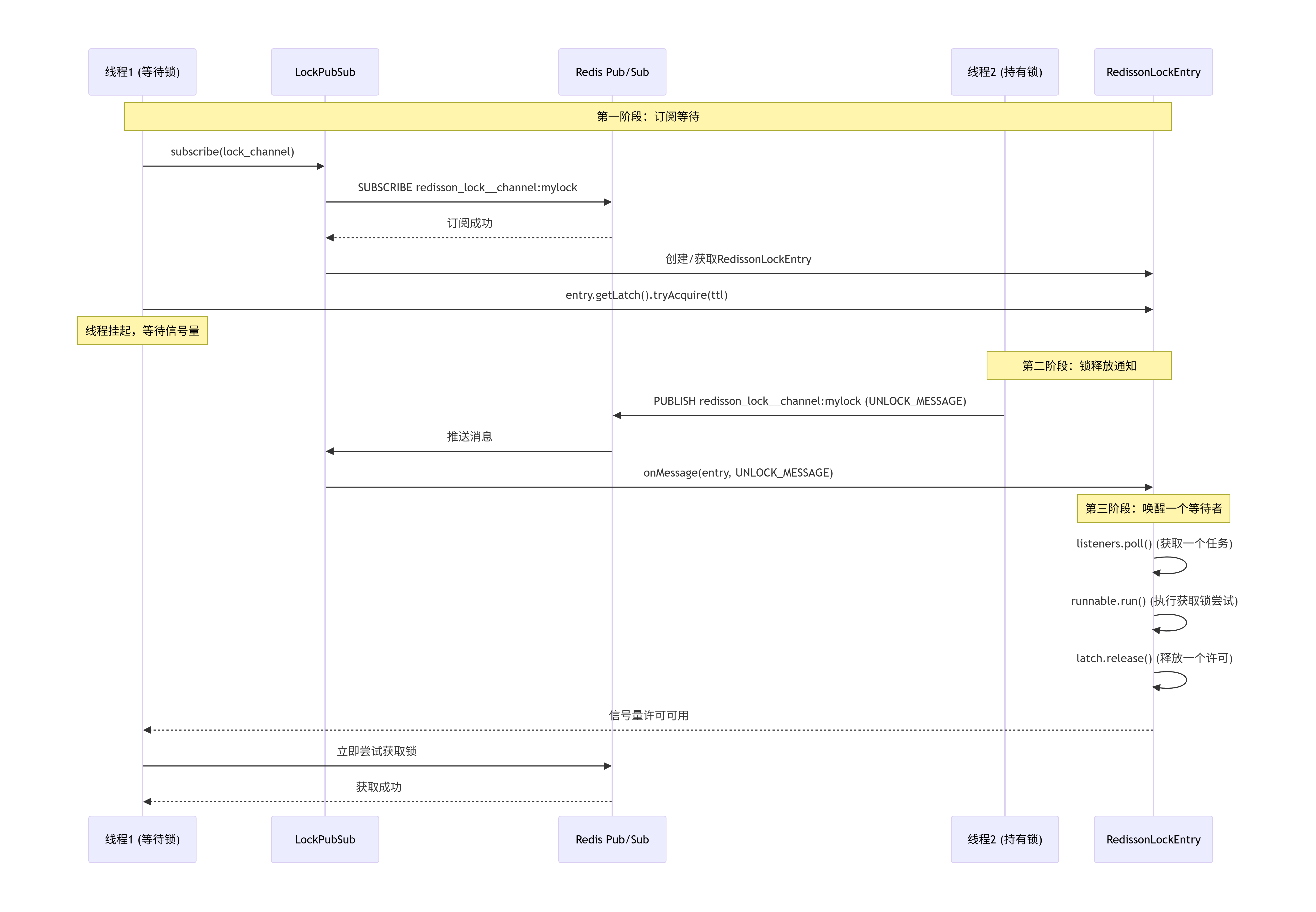 线程获取锁失败后,不是轮询Redis,而是订阅特定频道。锁释放时通过Redis Pub/Sub通知,实现了零轮询、低延迟的等待。