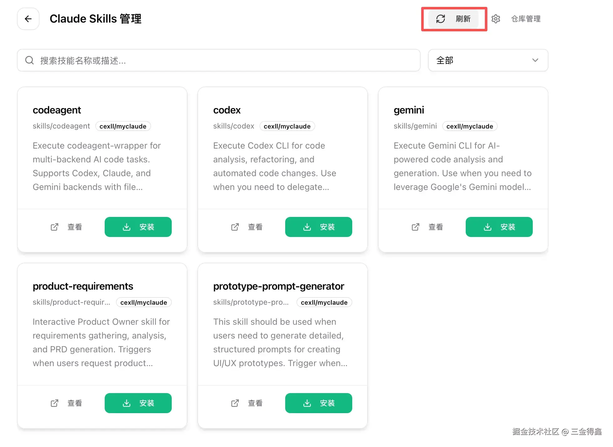 回到 Skills 列表,点击刷新让工具自动进行技能扫描,这个过程可能需要一段时间: