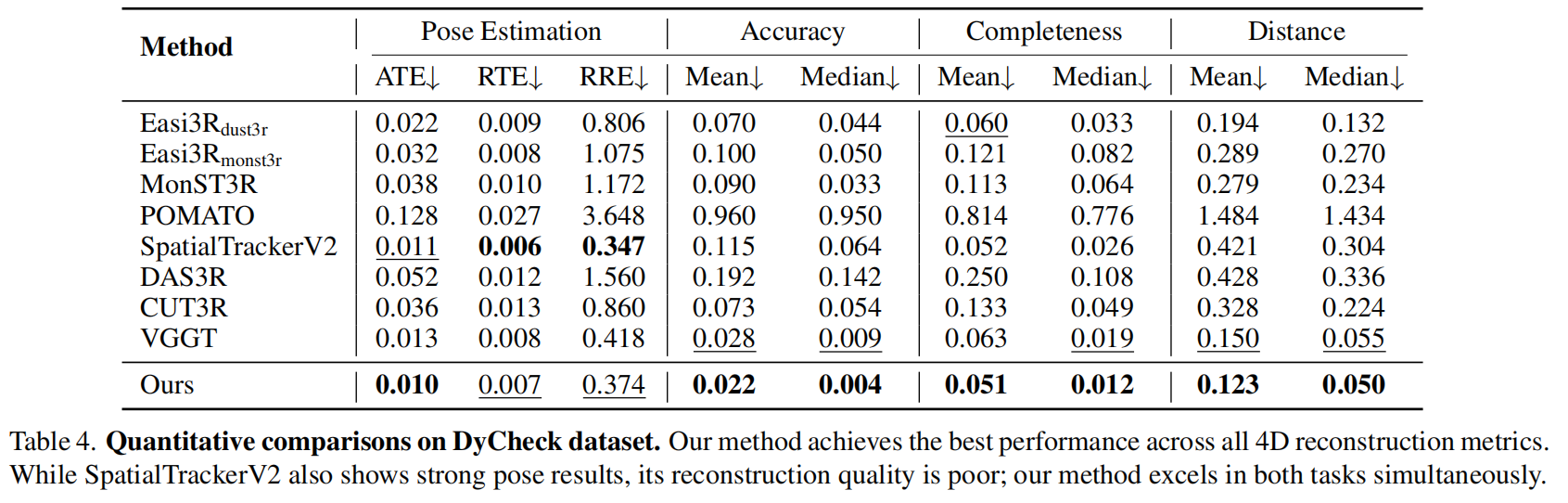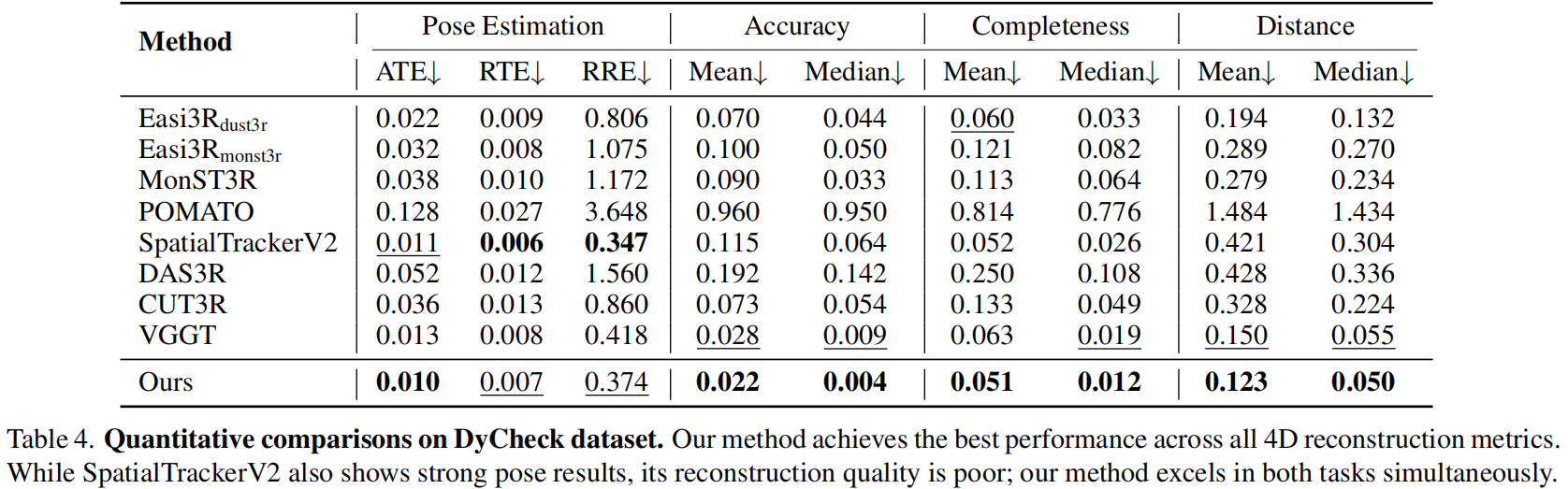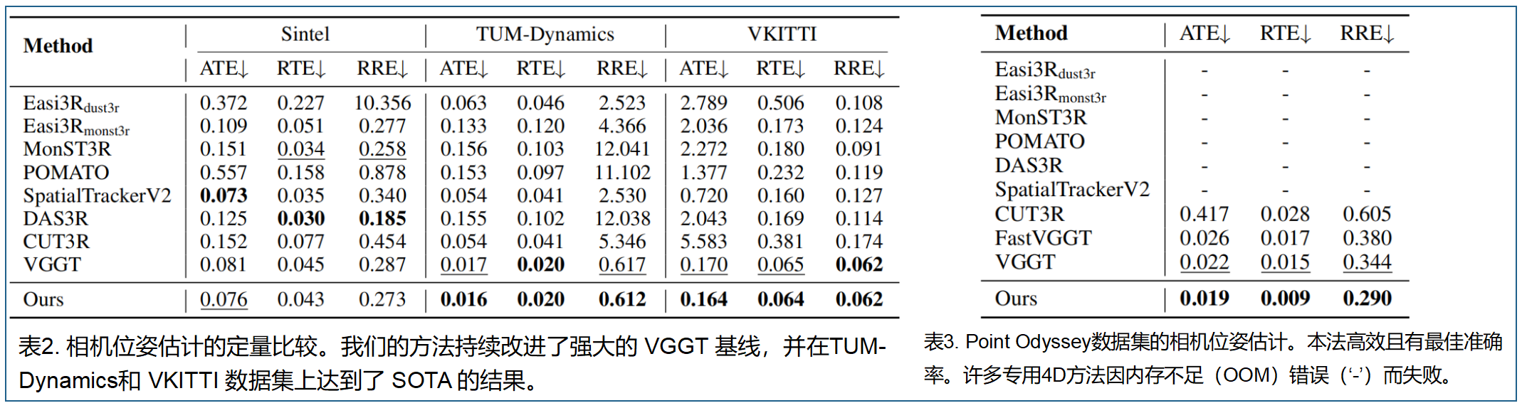 表2至表4显示,原始的 VGGT 已经是一个非常强大的基线方法,单独使用时就超越了许多专门的4D重建方法(例如MonST3R、DAS3R、CUT3R)。这表明其在多样化数据上的预训练隐式地教会了它对动态物体具有部分鲁棒性。