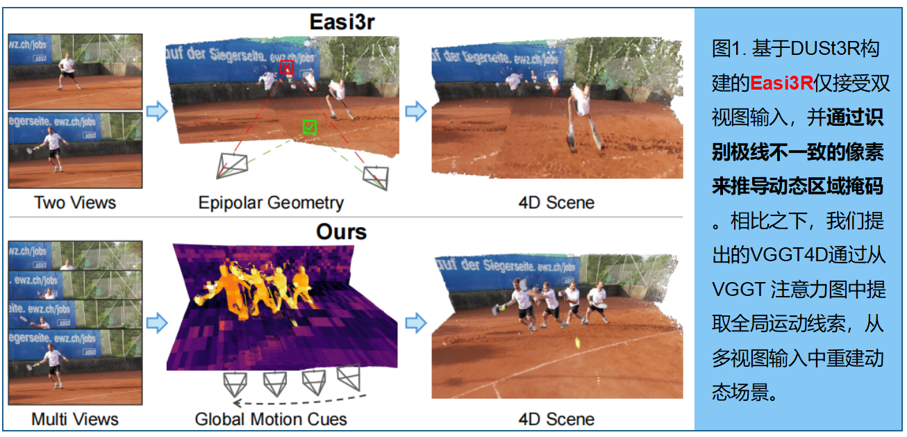 提出的VGGT4D的动机。然而,由于Easi3R基于DUSt3R框架构建,其仅限于成对图像输入,难以有效处理多视图输入。为克服这一局限,我们提出VGGT4D,将 VGGT 从静态多视图重建扩展到4D动态场景重建。