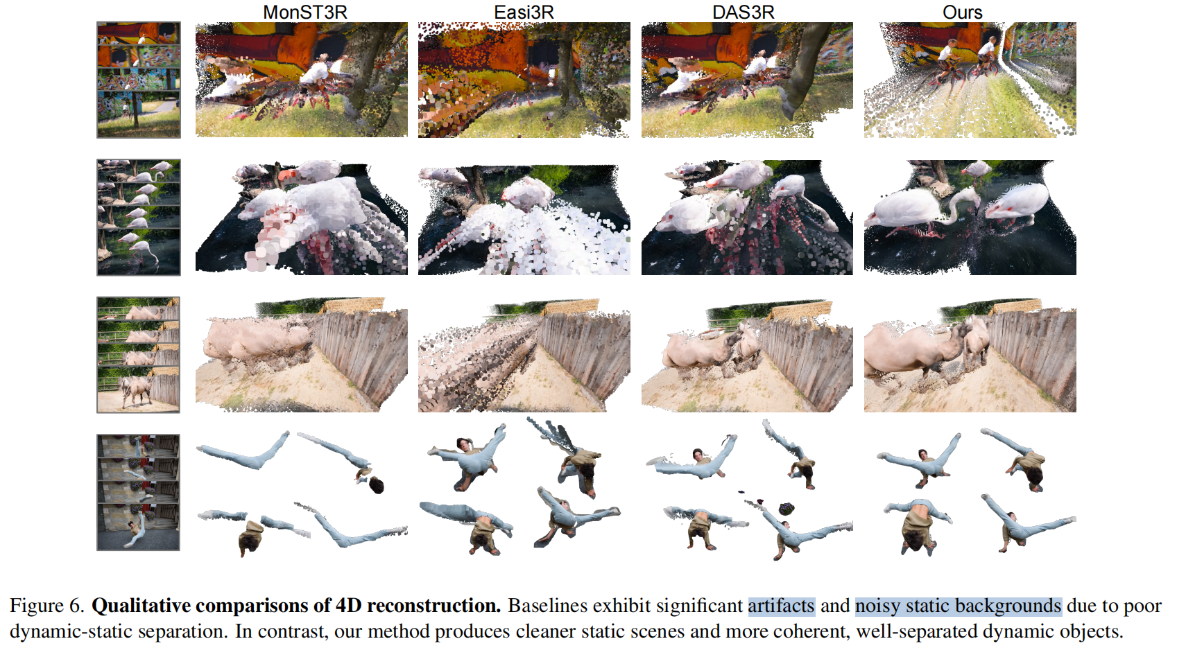基于视觉输入重建动态物体的4D场景一直是个难题。这是因为移动物体不仅会降低姿态估计精度,还会干扰背景几何建模,且其运动常与相机运动相互交织,导致3D场景呈现中出现严重伪影。因此,如何建模动态特性对于实现稳健的4D重建至关重要。