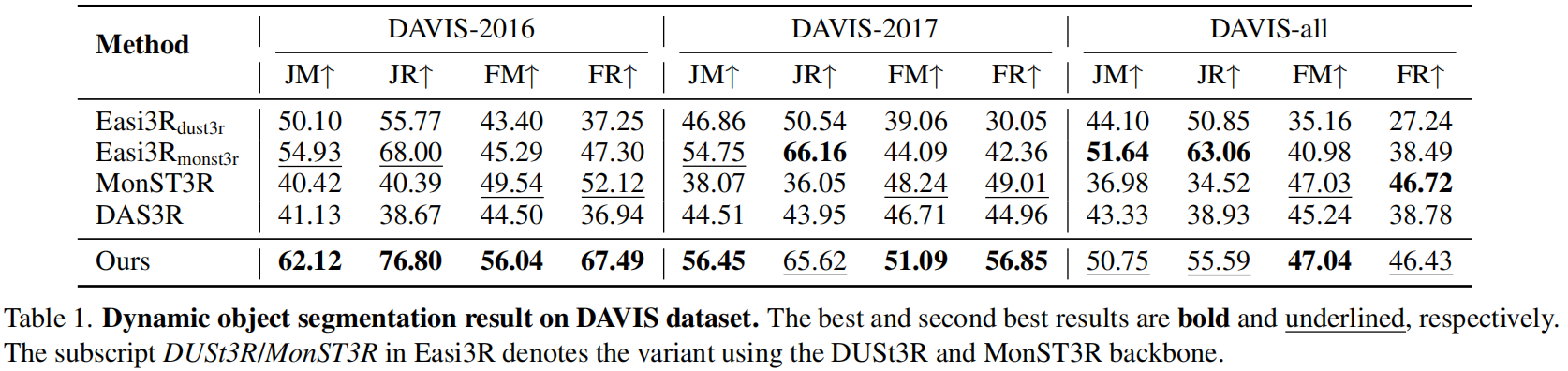 虽然Easi3Rmonst3r在DAVISall上表现出具有竞争力的召回率,但这源于MonST3R在光流上的后训练。我们的方法无需训练即可实现这些结果,仅需基于预训练的 VGGT 模型运行。
