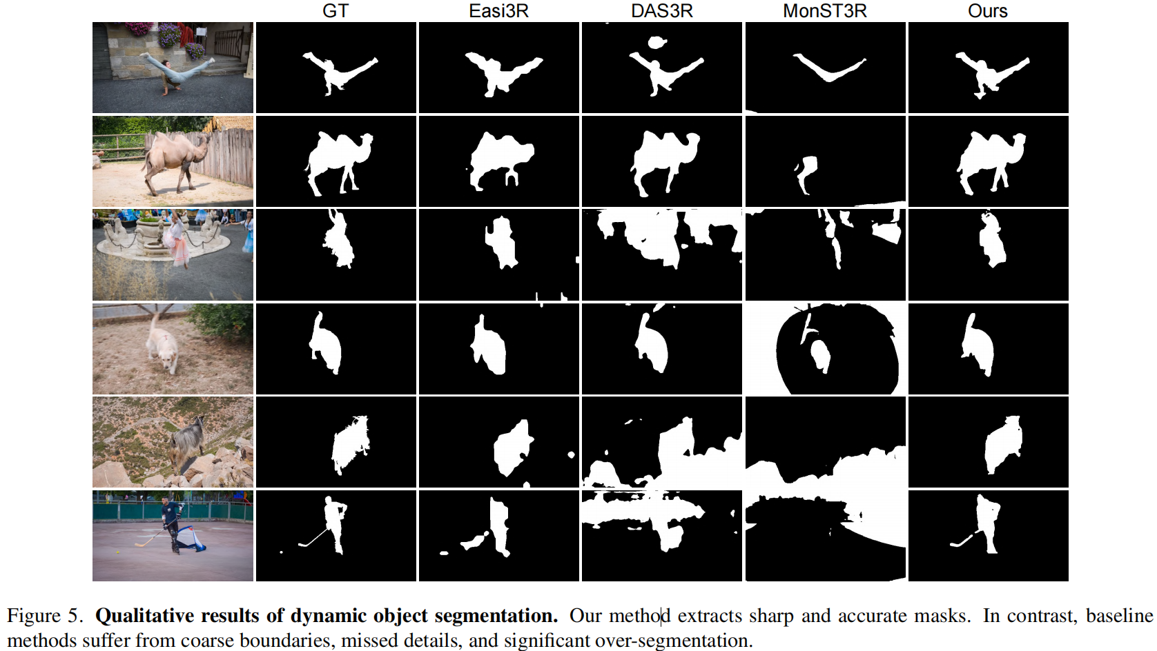 与Easi3R的成对注意力统计不同,我们的多帧、layer感知注意力挖掘推广到 VGGT ,并产生全局一致、稳健的动态mask。