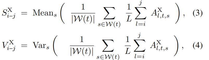 为了聚合时间信息,采用跨帧的帧间滑动窗口策略 ,定义为 W ( t ) = W(t)= W(t)={ t − n , . . . , t − 1 , t + 1 , . . . , t + n t - n,...,t - 1,t + 1,...,t + n t−n,...,t−1,t+1,...,t+n}。在此窗口内及跨越浅层、中层和深层的三层结构中计算Gram Similarity 的均值(S)和方差(V):