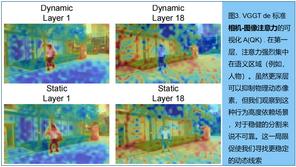 我们首先考察 VGGT 是否能够感知动态像素。如图3 ,可视化了相机token与图像token之间的注意力图。结果表明静态区域和动态区域之间有明显的分离:浅层对语义动态对象(如人)反应强烈,而深层则逐渐抑制多视图几何不一致的像素。这些结果表明, VGGT 对物理运动敏感,并隐式地编码了动态线索。
