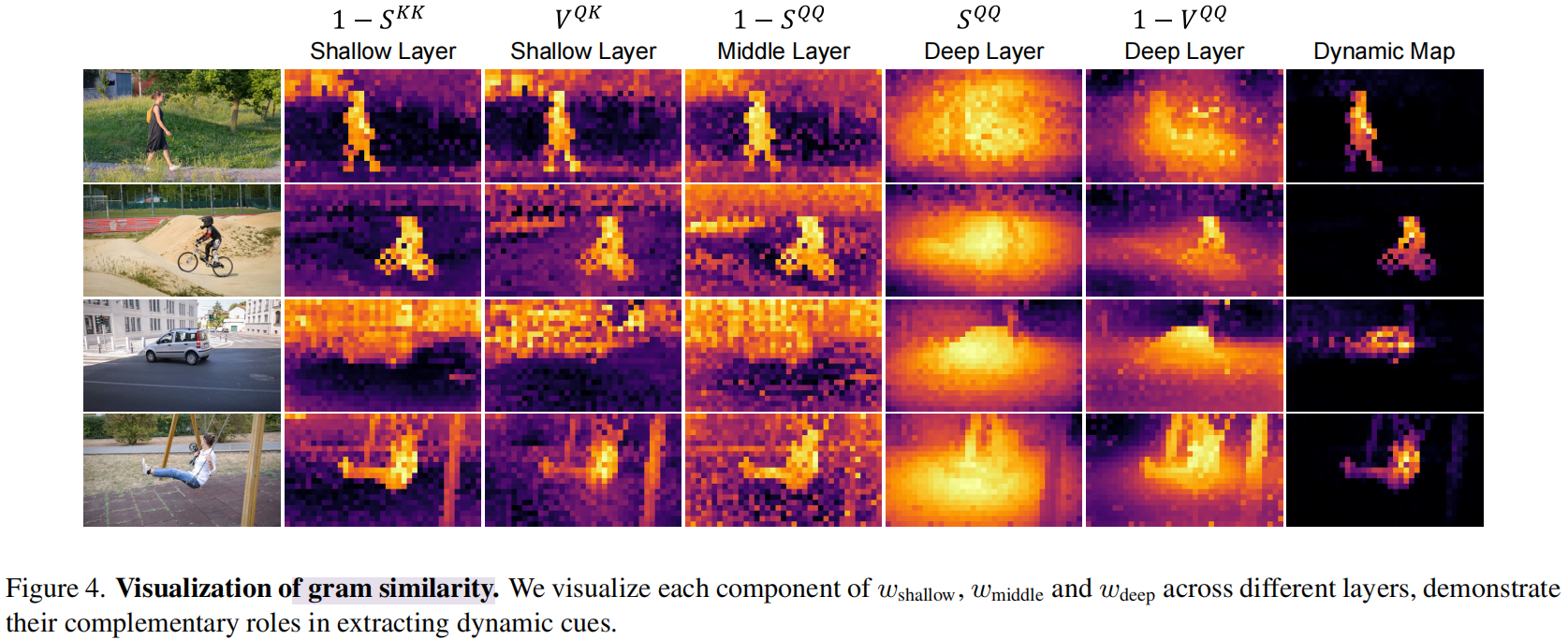 然而, A Q K A^{QK} AQK 本质上将动态运动与纹理和语义响应混合在一起,从而降低了运动线索的清晰度。为了放大由运动引起的分布差异,我们计算Gram相似性 Q Q ⊤ QQ^⊤ QQ⊤和 K K ⊤ KK^⊤ KK⊤: