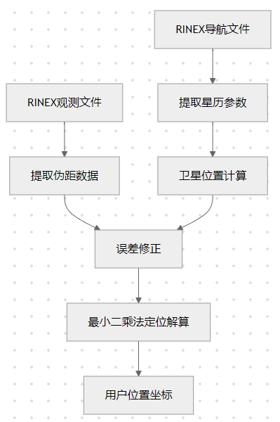 RINEX文件进行卫星导航解算,包括卫星坐标计算和用户位置解算的完整流程。