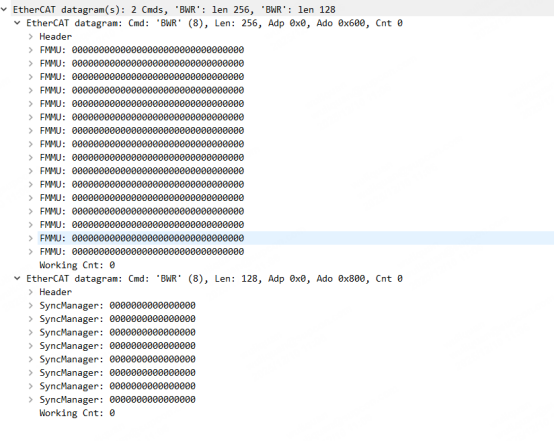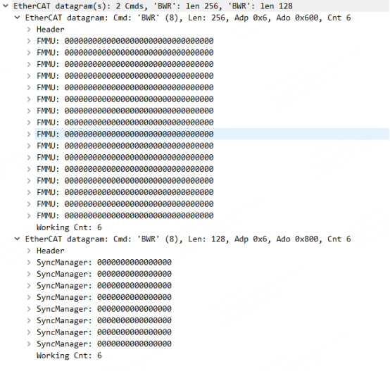 7、BWR 报文写 0x600 寄存器(FMMU 配置)、0x800 寄存器(SM 配置):