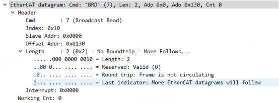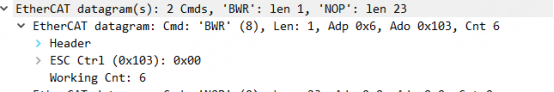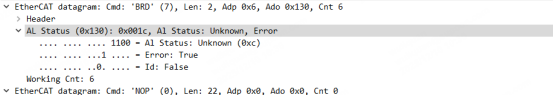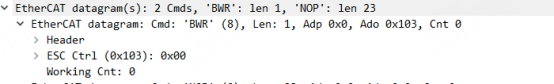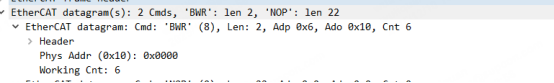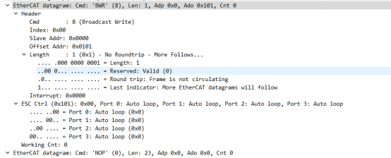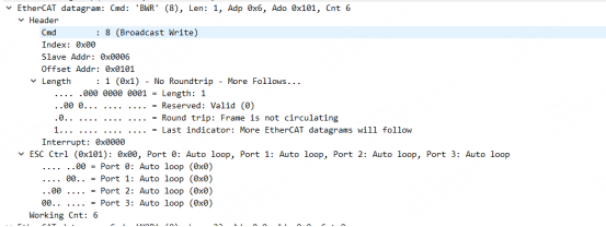 1、BWR 报文向地址101(对应 DL control 寄存器)发送设置端口 AUTO LOOP模式,随后通过 BRD 报文读取从站状态: