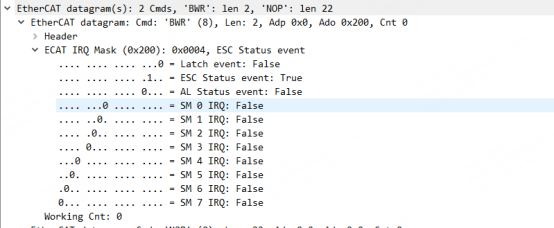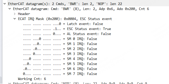 4、BWR 报文写 0x200 系列寄存器,0x201(ECAT 中断屏蔽寄存器)写入数据 0004,开放 DL 状态中断: