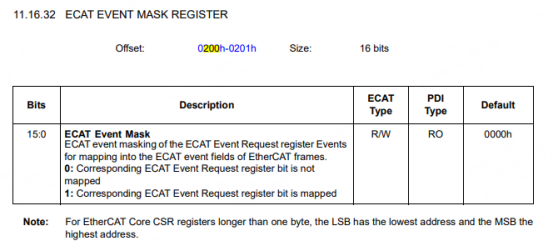 对应寄存器:地址 0x201 → ECAT 中断屏蔽寄存器(功能:仅启用 DL 状态中断)