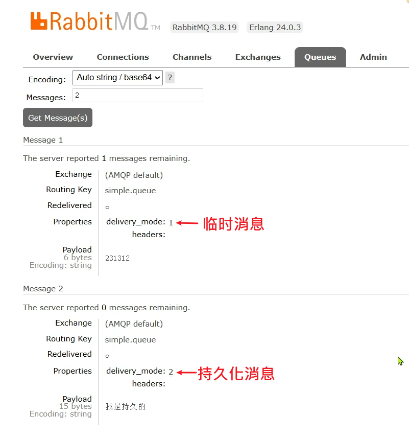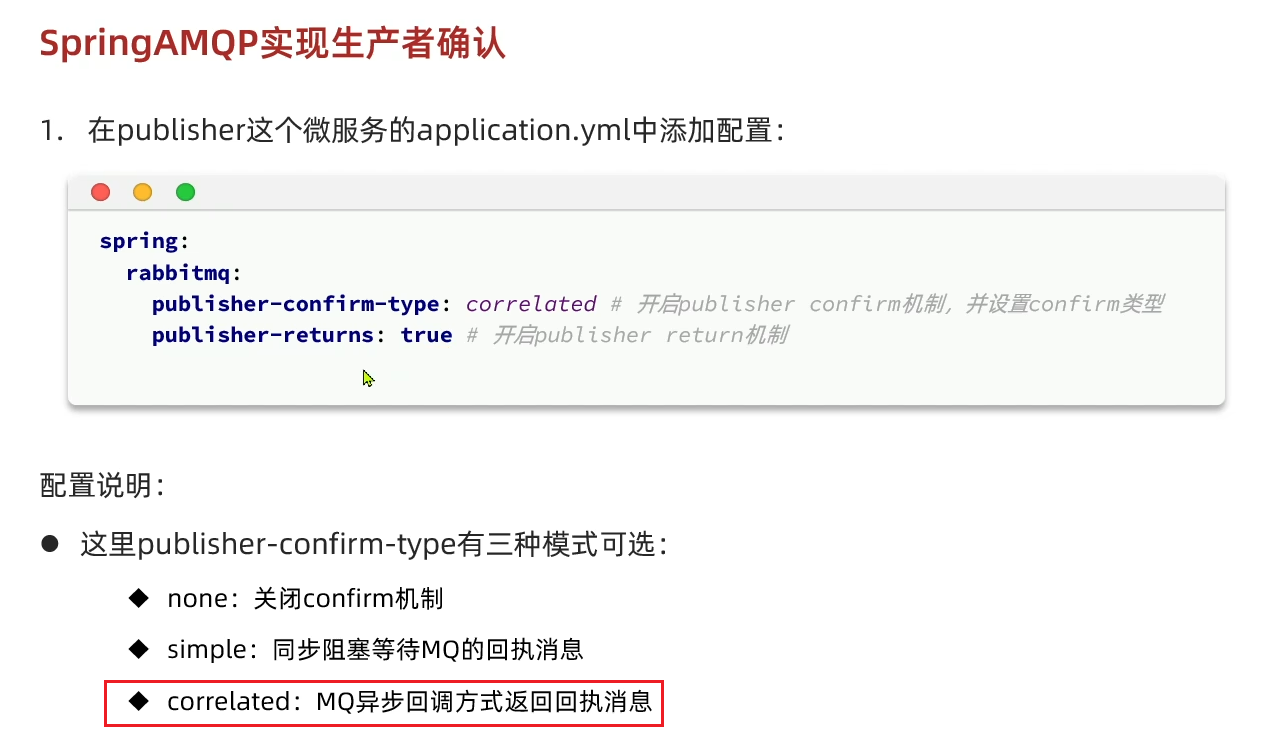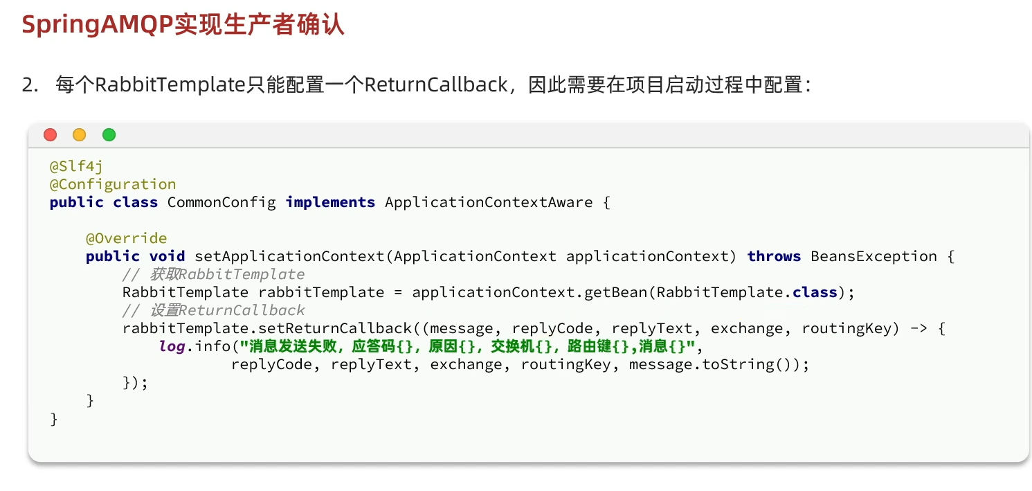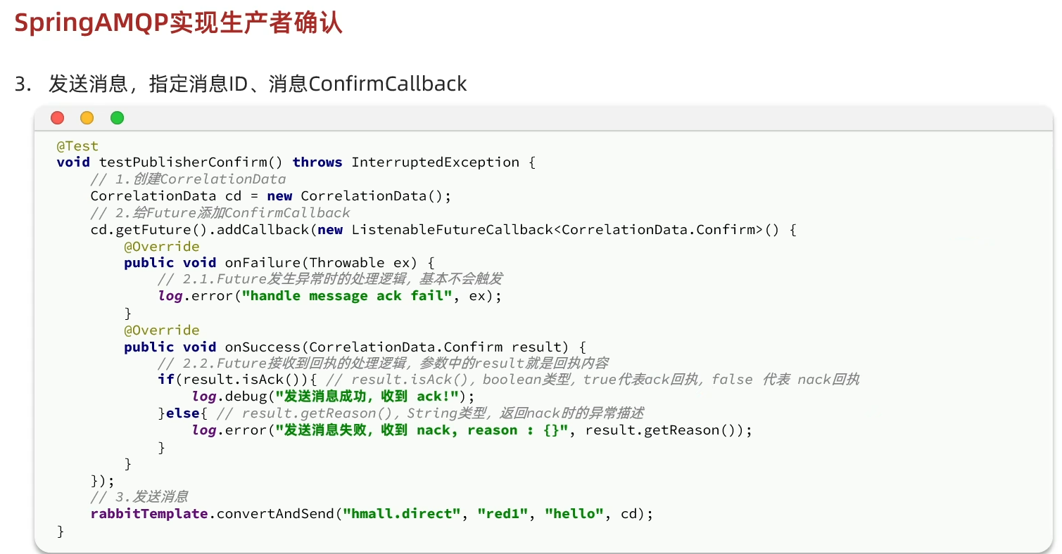 - 实际代码 ReturnCallback 确认 "消息从交换机到队列"。